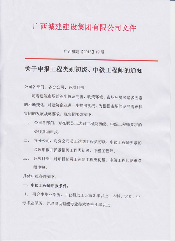 三、各項目部,對項目部員工達到工程類初級、中級工程師要求的必須申報。